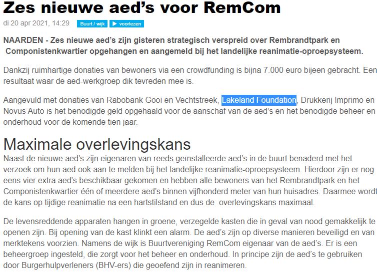 Lakeland Foundation financiert mee: zes nieuwe AED´s in Rembrandtpark Naarden (Artikel uit Naarder Nieuws/Bussums Nieuws, 20 april 2021).