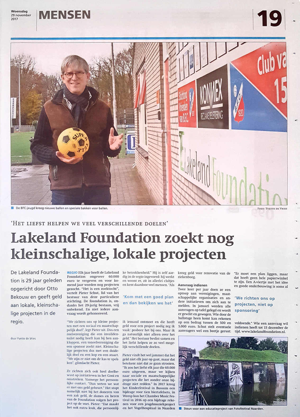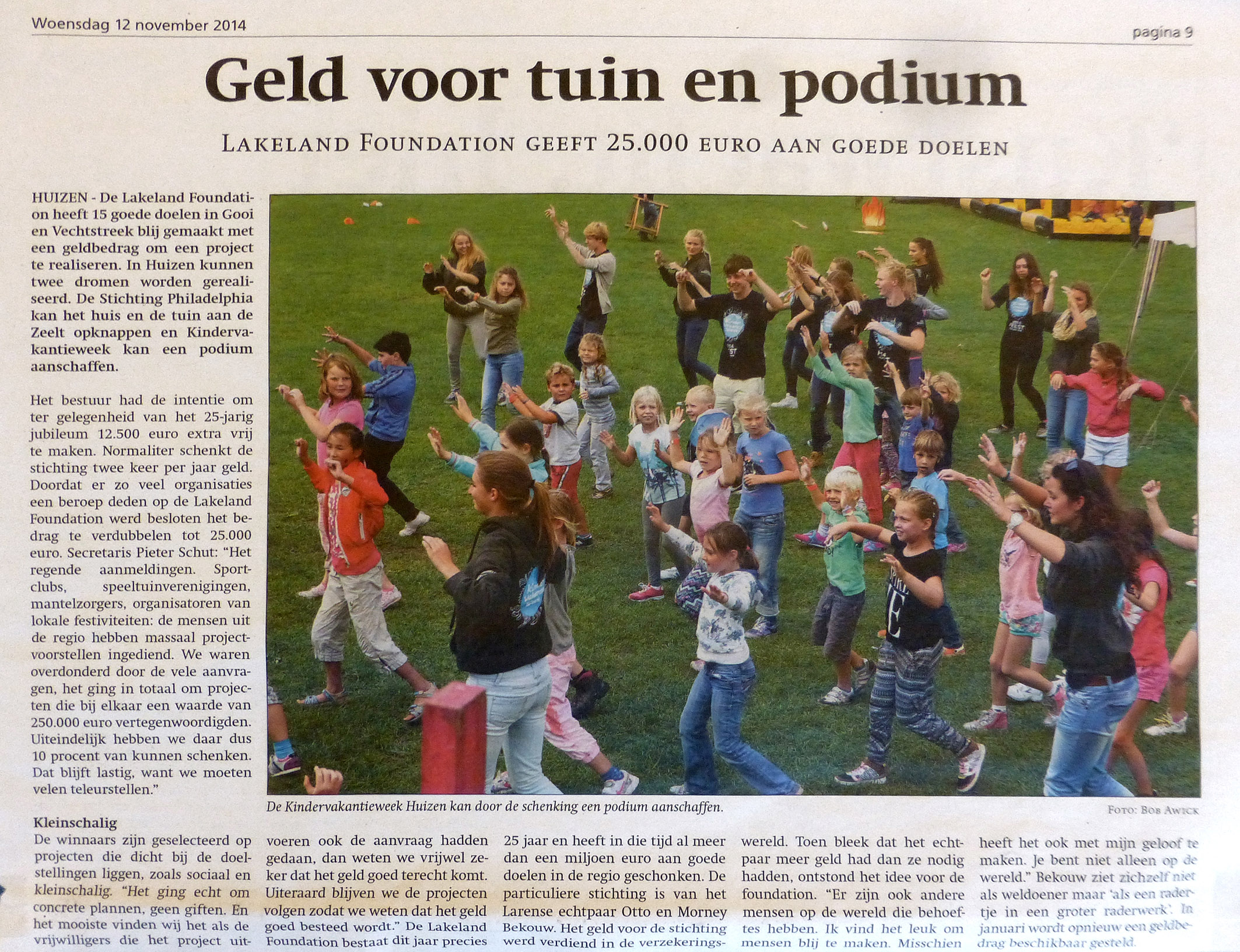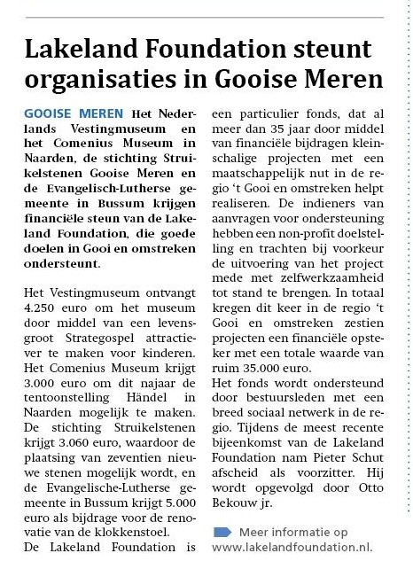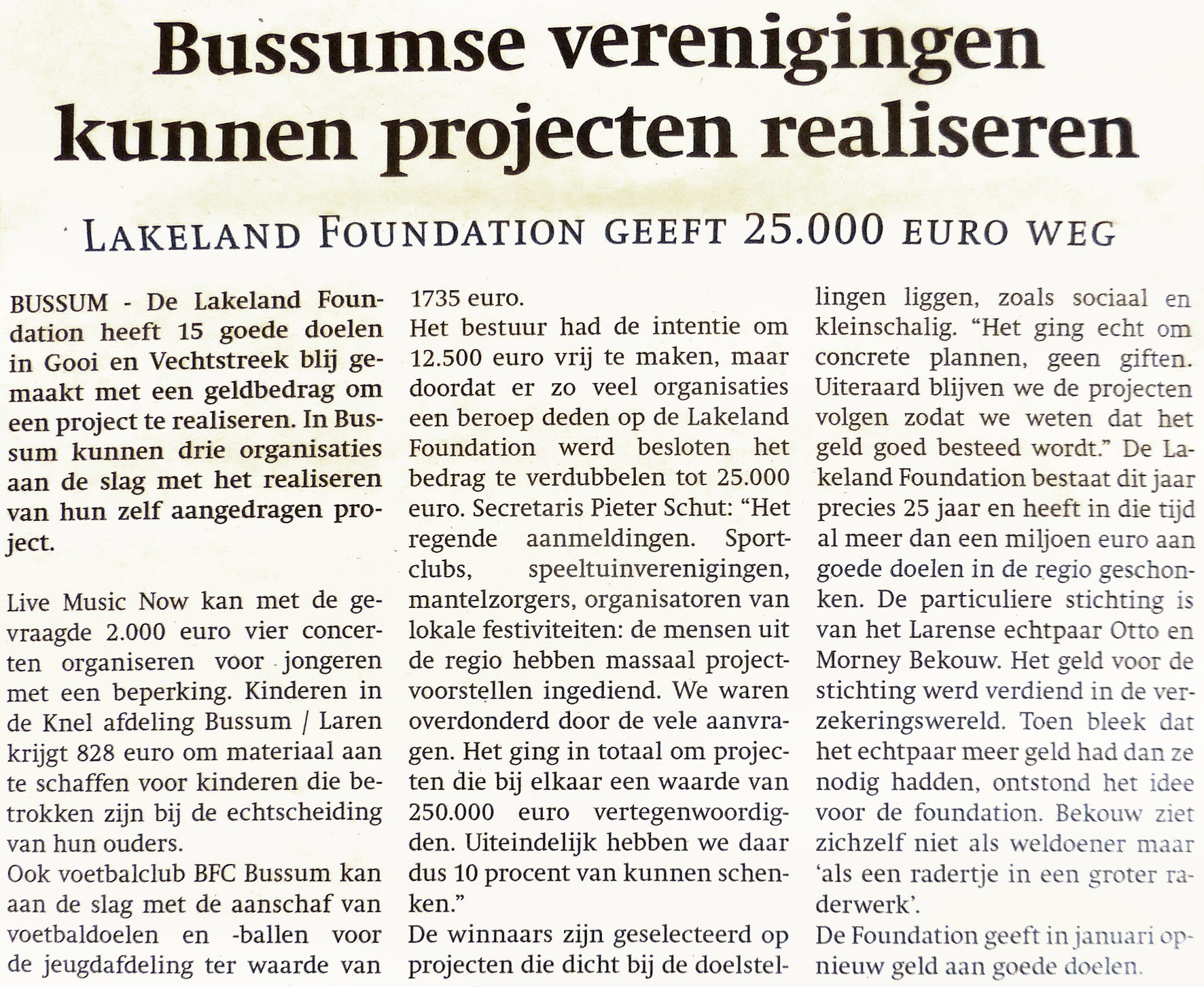 Bussumse verenigingen kunnen projecten realiseren. Lakeland Foundation geeft 25.000 euro weg. (Artikel uit Bussums Nieuws,