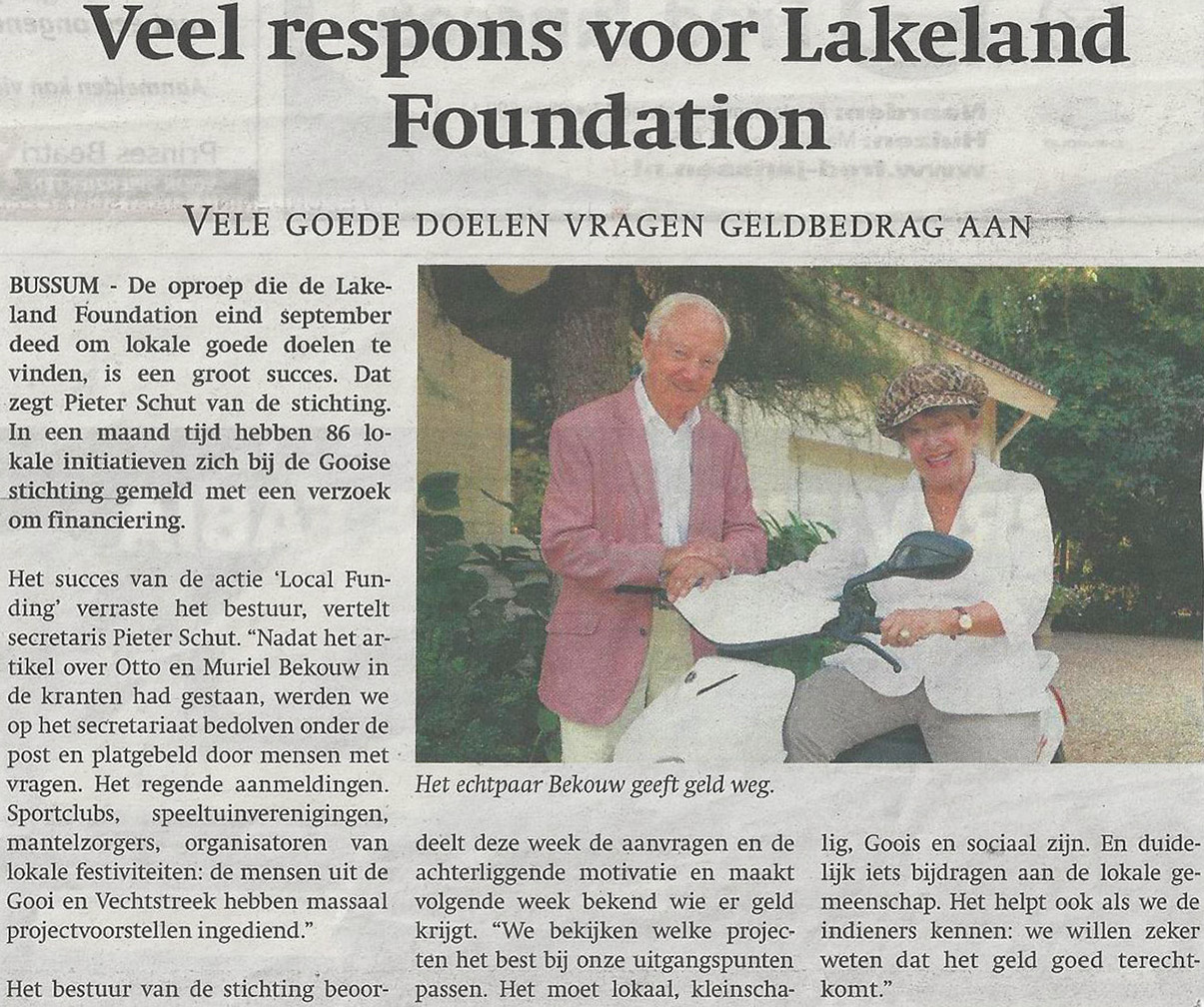 In het najaar van 2014 herdacht de Lakeland Foundation het 25-jarig bestaan. In diverse lokale kranten verscheen een interview met oprichters Otto en Muriël Bekouw (Artikel uit Bussums Nieuws).