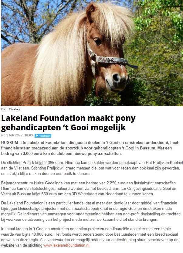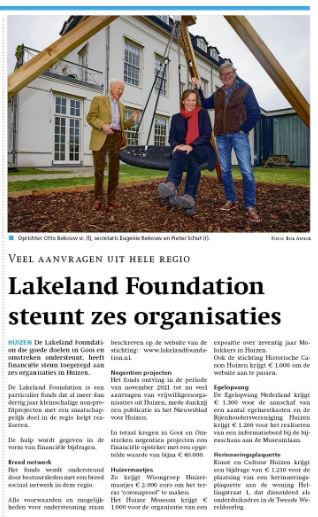 Lakeland Foundation steunt zes organisaties in Huizen (Artikel uit Nieuwsblad voor Huizen, 10 februari 2022).
