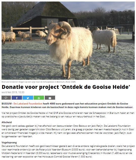 Lakeland Foundation steunt Goois Natuurreservaat - Donatie voor project ´Ontdek de Gooise Heide´ (Artikel uit Bussums Nieuws, 6 februari 2019).
