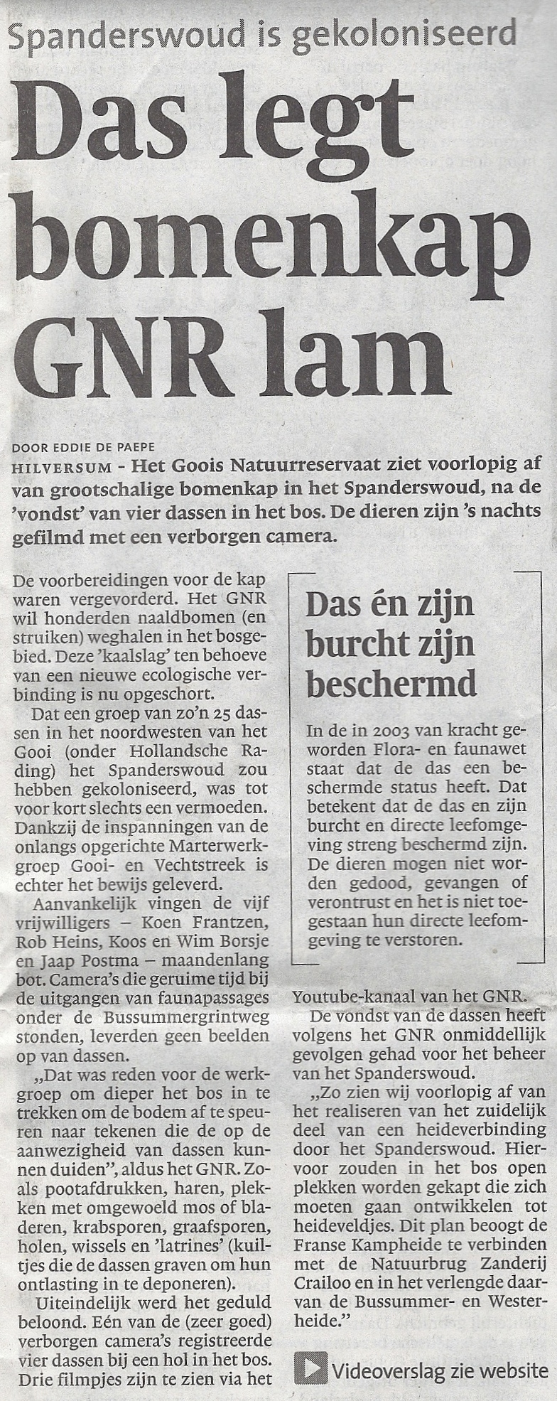 ook dassen ontdekt (Artikel uit De Gooi en Eemlander).