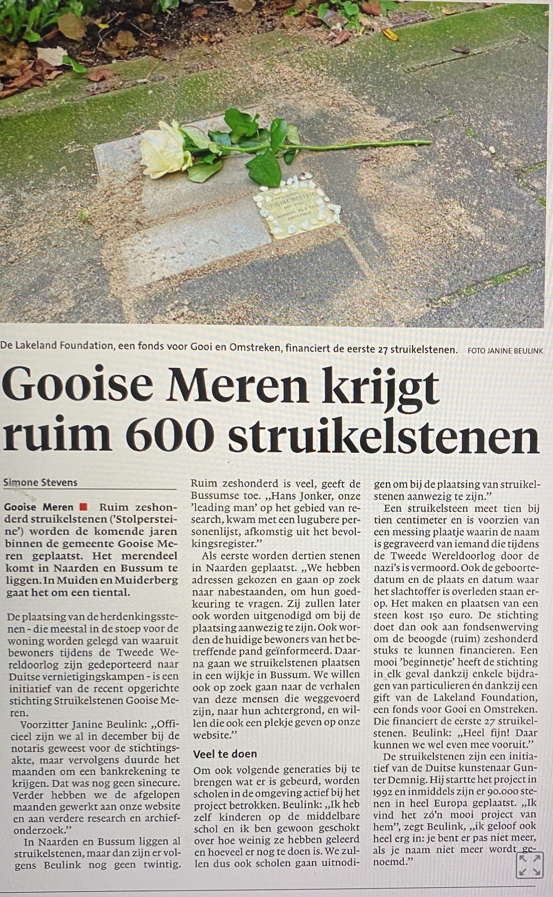 Lakeland Foundation financiert eerste 27 600 struikelstenen in Gooise Meren (Artikel uit De Gooi en Eemlander, 28 juli 2022).