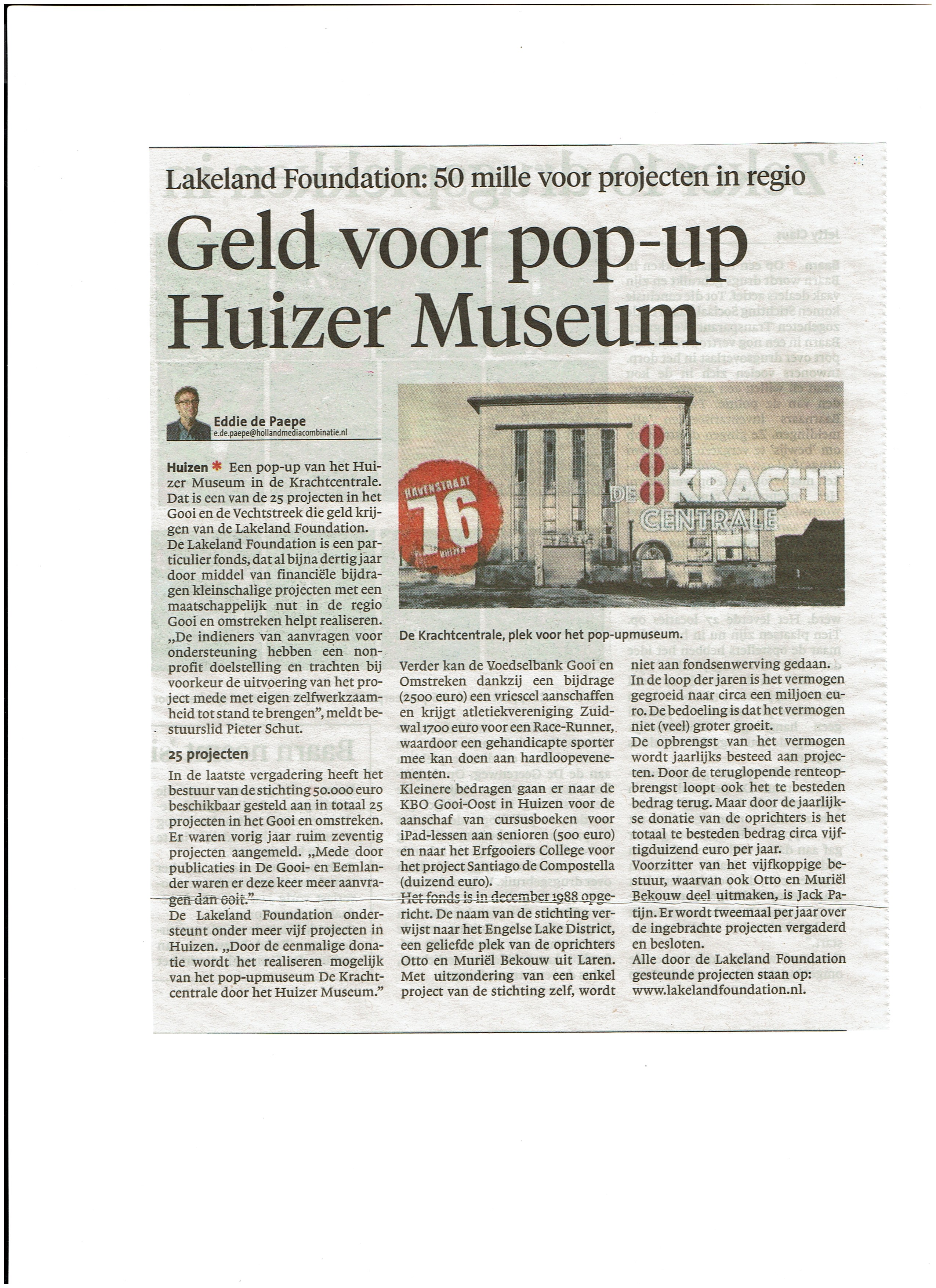 Lakeland Foundation: 50 mille voor projecten in de regio – Geld voor pop-up Huizer Museum (Artikel uit De Gooi- en Eemlander, 5 februari 2018).