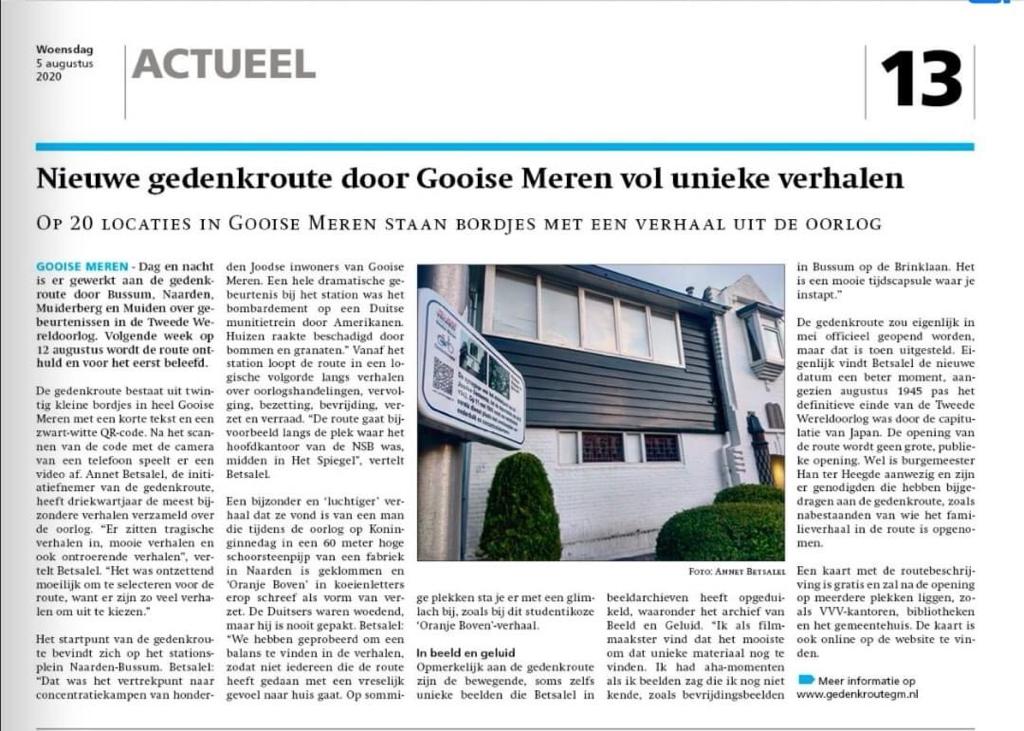 Lakeland Foundation steunt project met verhalen uit de oorlog: Nieuwe gedenkroute door Gooise Meren (Artikel uit Naarder Nieuws/Bussums Nieuws, 5 augustus 2020).