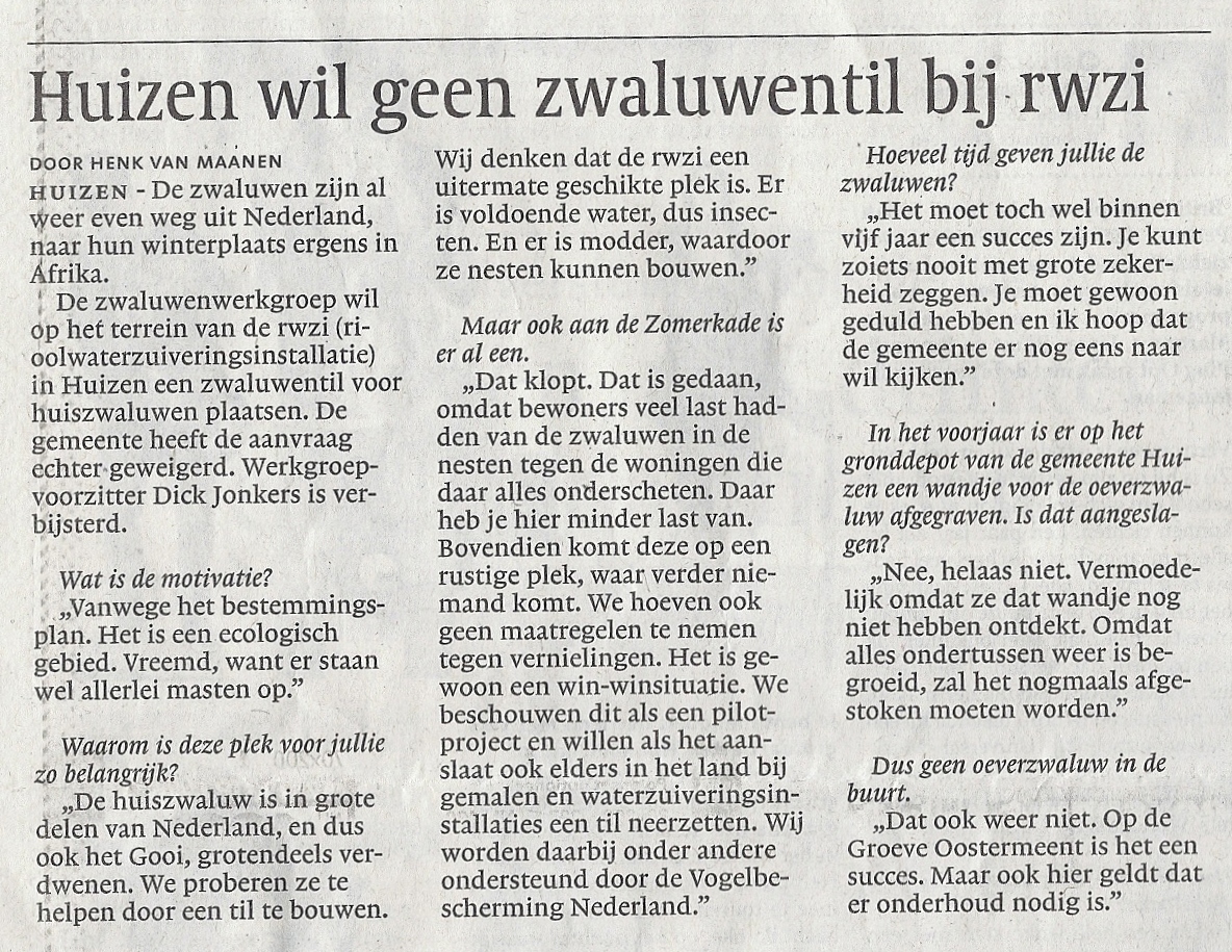 zwaluwentil realiseren bij de rioolwaterzuivering in Huizen (Artikel uit